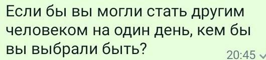 It's a hard question for me because I think it's pointless to take someone else's role, even for a one day. In my opinion, it may lead to negative consequenses. I can't imagine living with thought that everything has changed for another person due to my curiosity. So, if I could become someone else for a one day, I wouldn't choose someone famous or someone who has a lot of money. Some people would do that just to see what the "real life" is, but I believe that all people already have their own real life, and it's not right to want to be someone else, even for some time. I'd rather leave everything as it is, but if it was really needy for me to make a decision, it would be someone who knows much more than other people. I don't know who it exactly is, but I feel like it would be an old man whose experience and knowledge are needy to discover something new.
