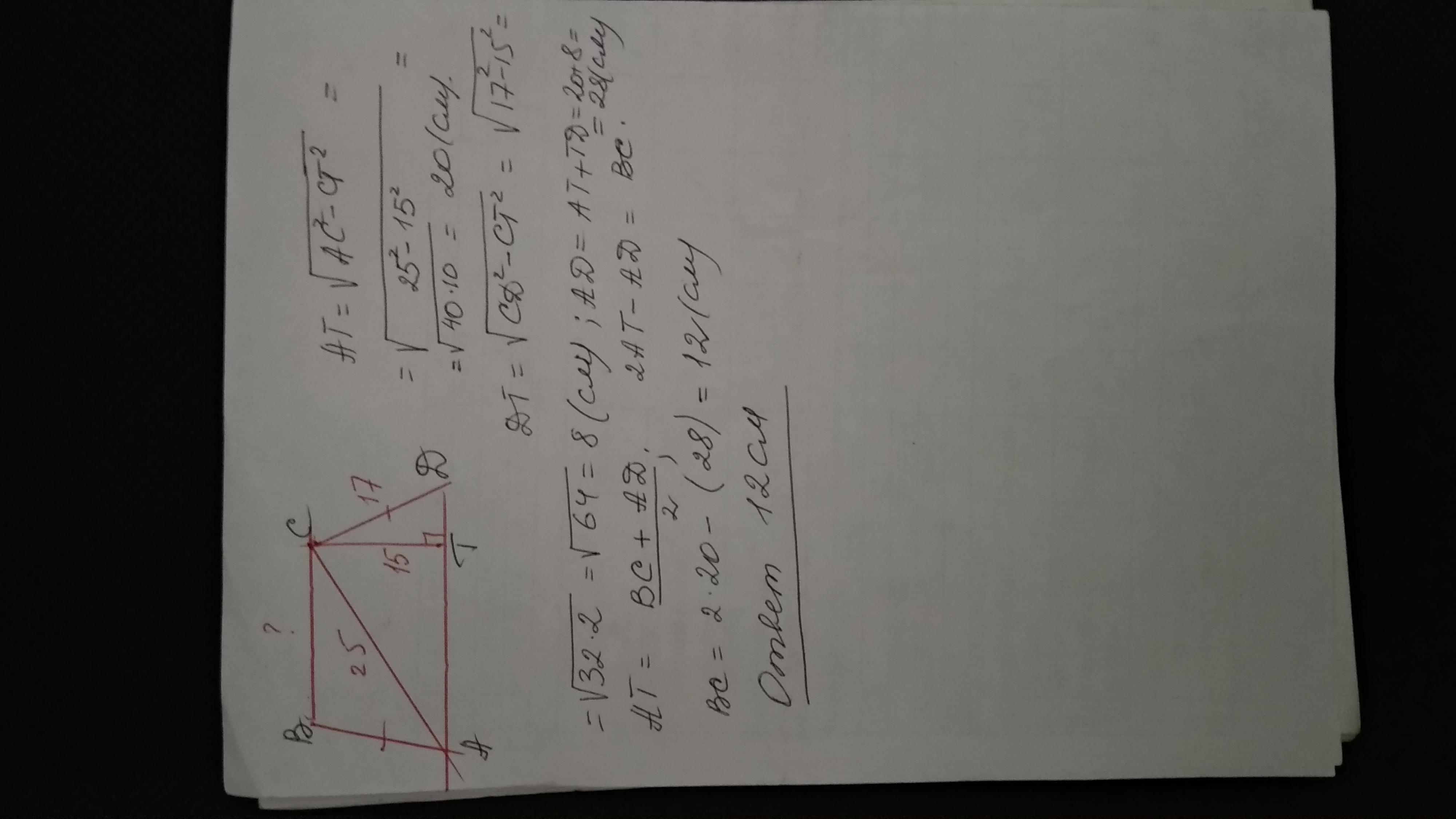 В равнобедренной трапеции боковая сторона равна 17см, диагональ равна 25 см,а высота 15 см. Найти меньшее основание