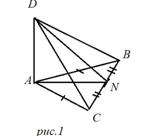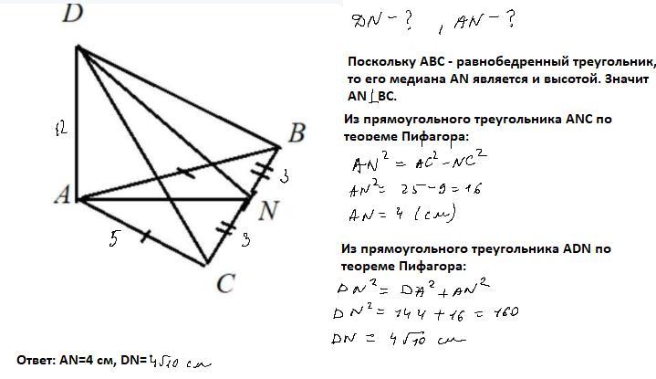 Отрезок АD перпендекулярен к плоскости равнобедренного треугольника ABC . Известно, что AB=AC=5см , ВС=6см, AD=12см