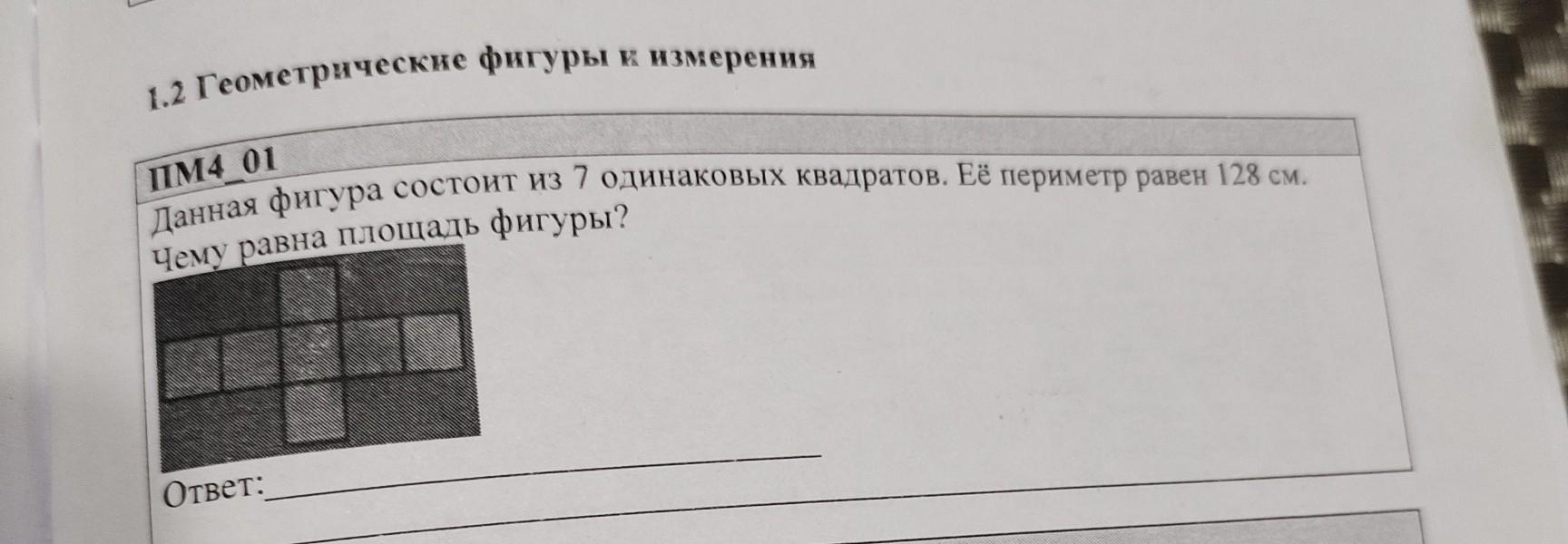 данная фигура состоит из 7 одинаковых квадратов. Ее периметр равен128см. Чему равна площадь фигуры?
