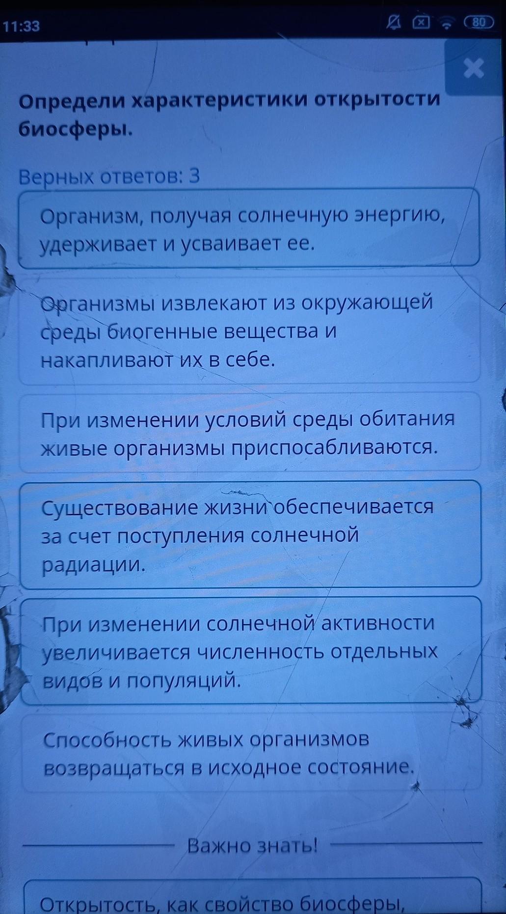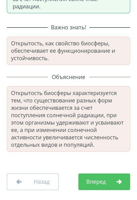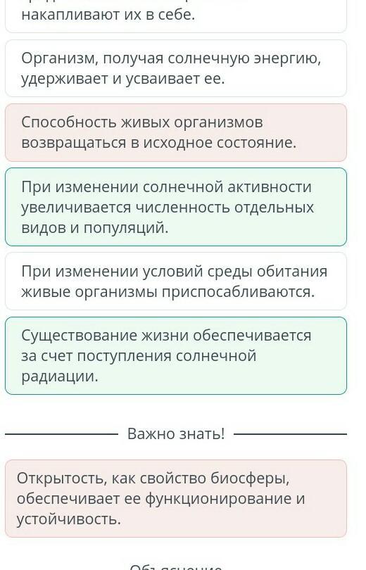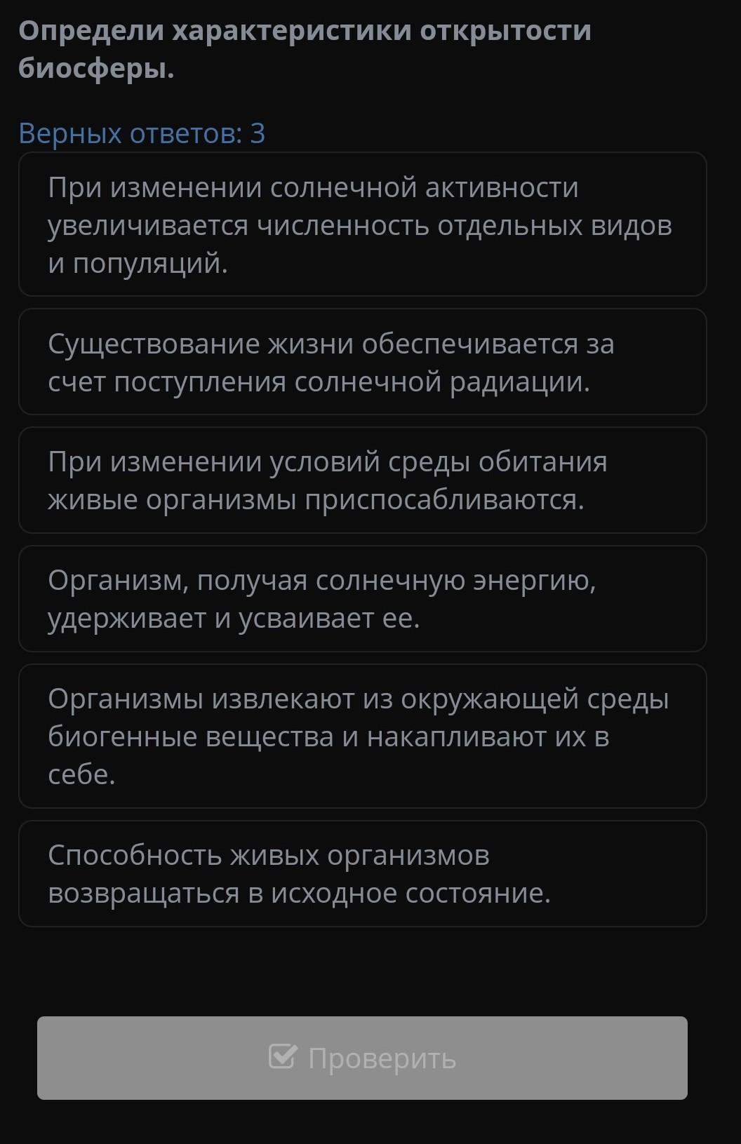 Биосфера и ее составные части Определи характеристики открытости биосферы. Верных ответов: 3 При изменении солнечной активности увеличивается численность отдельных видов и популяций. Существование жизни обеспечивается за счет поступления солнечной радиации. При изменении условий среды обитания живые организмы приспосабливаются. Организм, получая солнечную энергию, удерживает и усваивает ее. Организмы извлекают из окружающей среды биогенные вещества и накапливают их в себе. Способность живых организмов возвращаться в исходное состояние