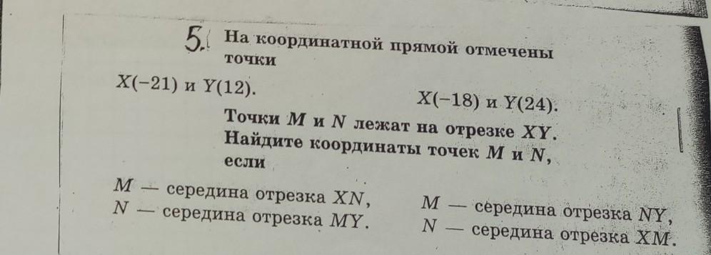От координаты точки У отнимем координаты точки Х, получим длину отрезка ХУ, она равна 24-(-18)=42, т.к. точки М и N делят отрезок ХУ на три равные части, то 42/3=14, координата точки М равна -18+14=-4, а координата точки N равна -4+14=10, и соответственно координата точки У равна 10+14=24, что и дано по условию.