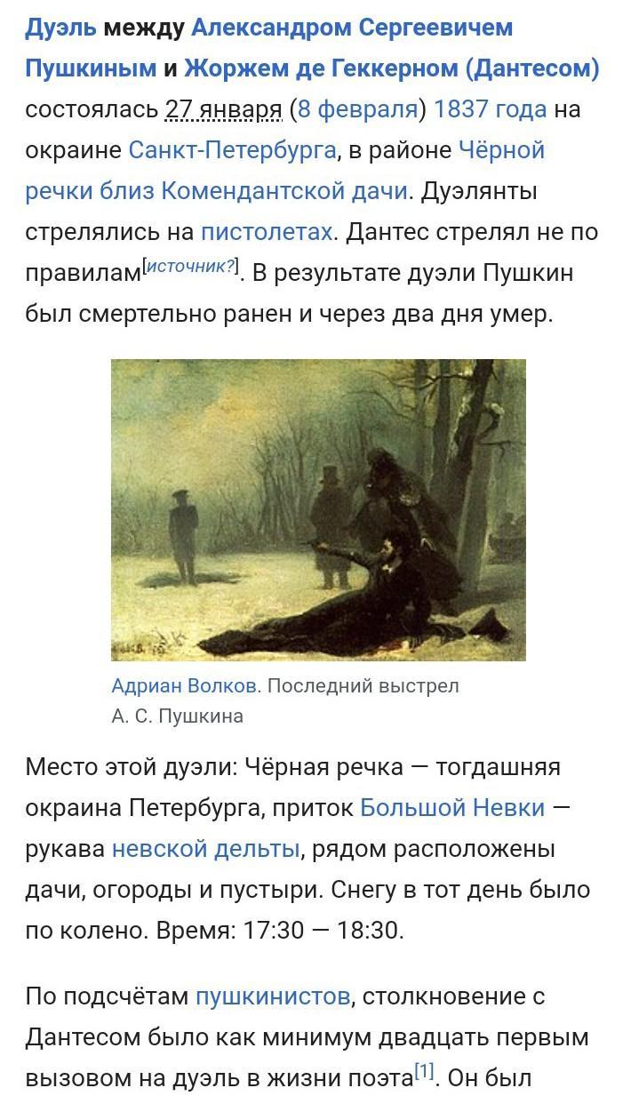 1837 года произошла дуэль великого русского поэта и писателя Александра Пушкина с французским подданным Жоржем Дантесом в предместье Петербурга — на Черной речке. От раны, полученной на дуэли, 10 февраля умер