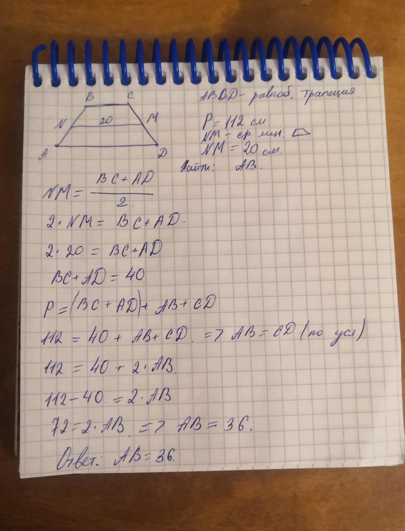 периметр равнобокой трапеции 112 см, средняя линия трапеции 20 см. найдите длину боковой стороны трапеции