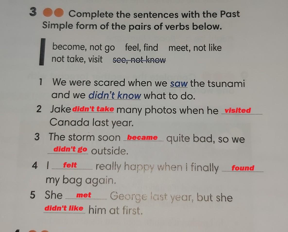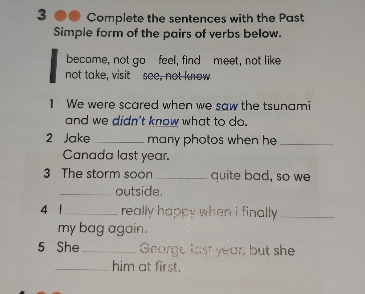 TI td Complete the sentences with the Past Simple form of the pairs of verbs below. fo ус become, not go feel, find meet, not like not take, visit see, not know ас 6 ea 1 We were scared when we saw the tsunami and we didn't know what to do. 2 Jake many photos when he Canada last year. 3 The storm soon quite bad, so we outside. 4 1 really happy when I finally my bag again. 5 She George last year, but she him at first.