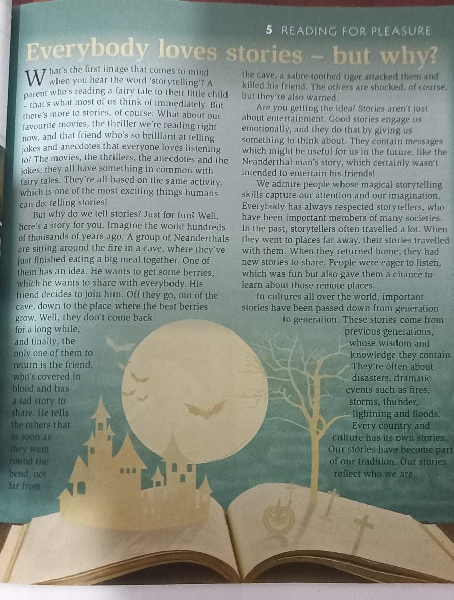 1 What examples does the writer give to show that storytelling is popular in the modern world? 2 What point is the writer making in paragraph 2? 3 What did the Neanderthal man not want to do when telling the story? 4 How have storytellers contributed to society in different cultures? 5 How did storytellers manage to keep people interested in their stories over the years? 6 Why can stories be very important for a country and its culture?