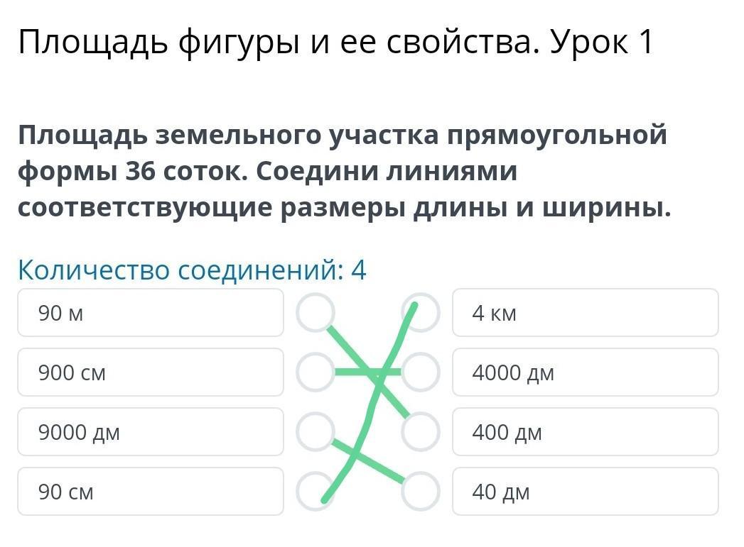 Площадь земельного участка прямоугольной формы 36 соток. Соедини линиями соответствующие размеры длины и ширины. Количество соединений: 4 4 км 4000 дм 90 M 9000 дм 90 cm 900 см 40 дм 400 дм