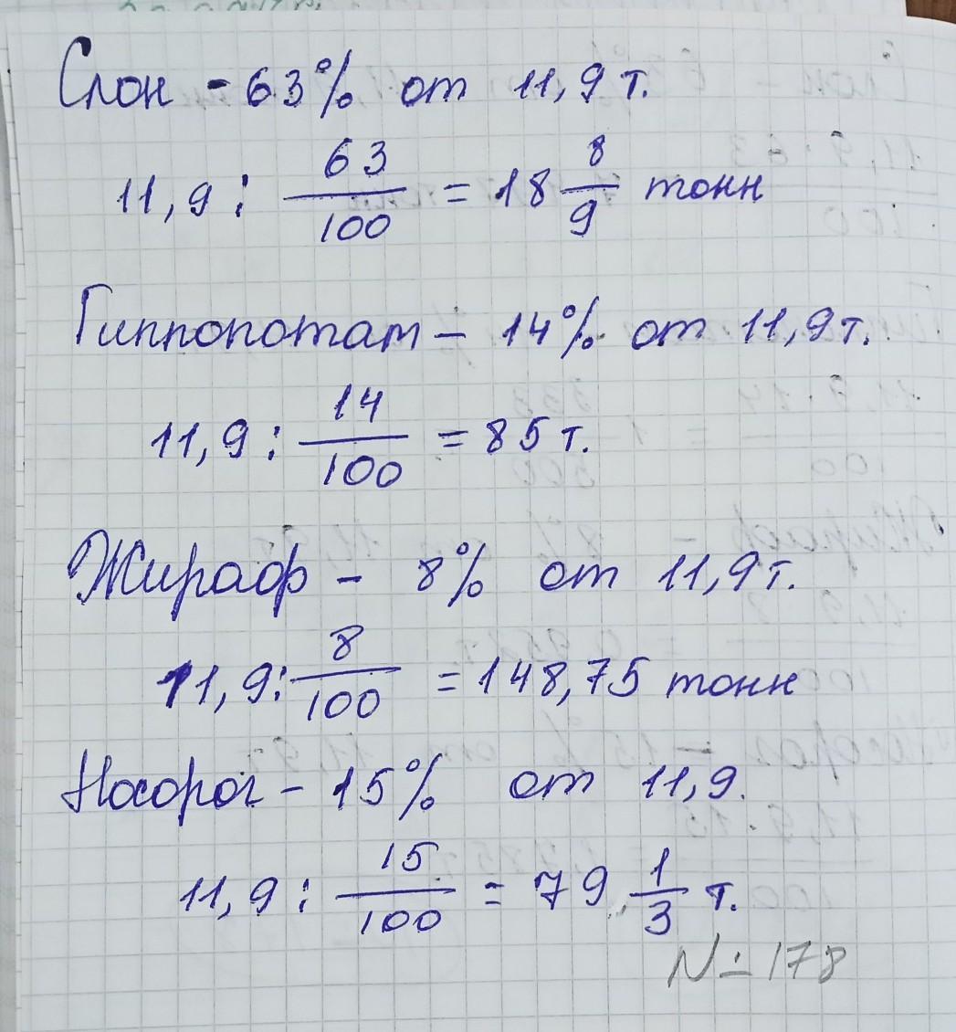В №178 дают процент от общей массы. Зная процент и массу можно найти вес каждого животного. Формула решения: %/100