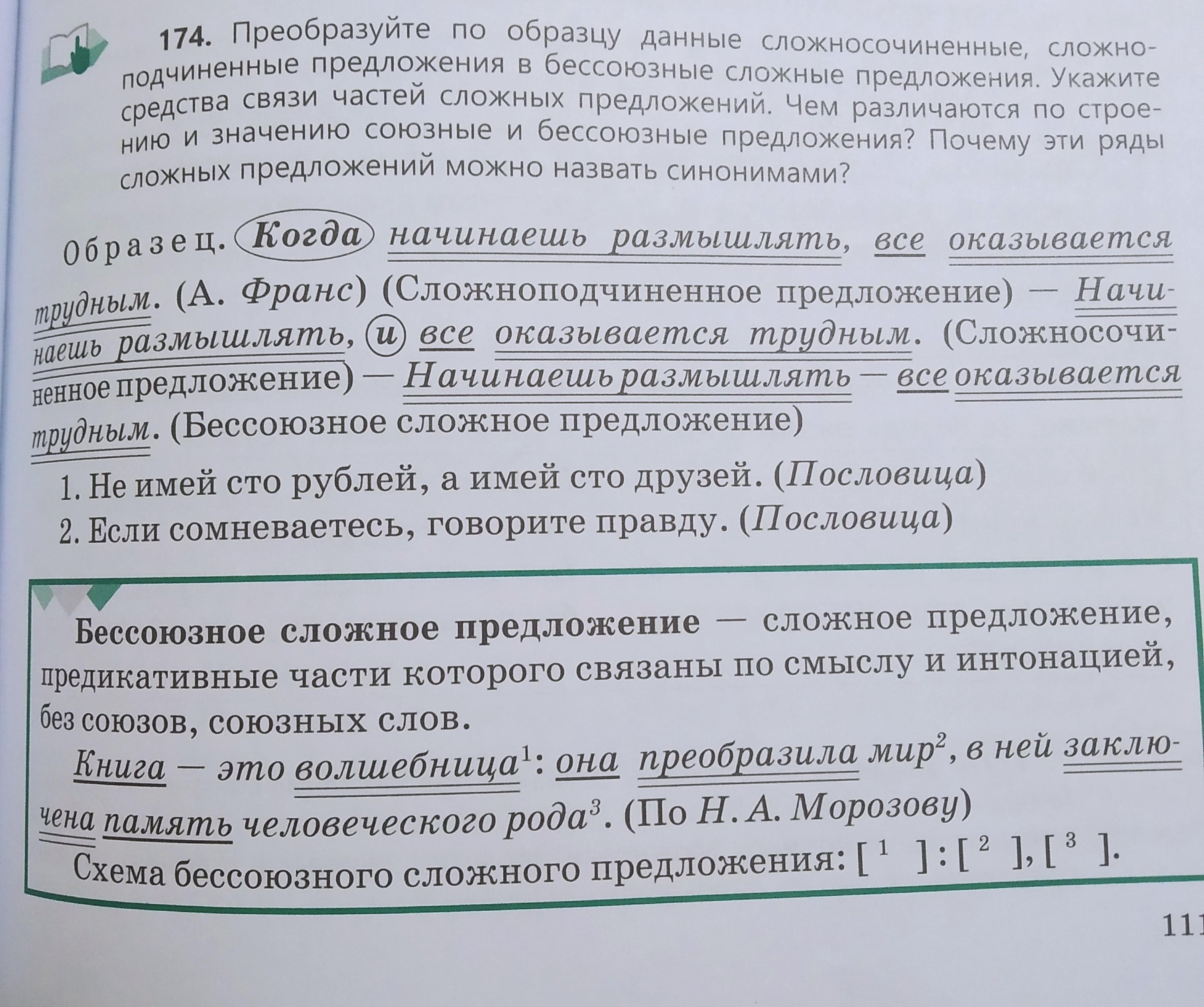 СРОЧНО ПЖПЖПЖ Преобразуйте по образцу данные сложносочиненные, сложно- подчиненные предложения в бессоюзные сложные предложения. Укажите средства связи частей сложных предложений. Чем различаются по строе- нию и значению союзные и бессоюзные предложения? Почему эти ряды сложных предложений можно назвать синонимами? все оказывается Образец. Когда начинаешь размышлять, все оказывается трудным. (А. Франс) (Сложноподчиненное предложение) - Начи- наешь размышлять, и все оказывается трудным. (Сложносочи- ненное предложение) Начинаешь размышлять трудным. (Бессоюзное сложное предложение) 1. Не имей сто рублей, а имей сто друзей. (Пословица) 2. Если сомневаетесь, говорите правду. (Пословица)