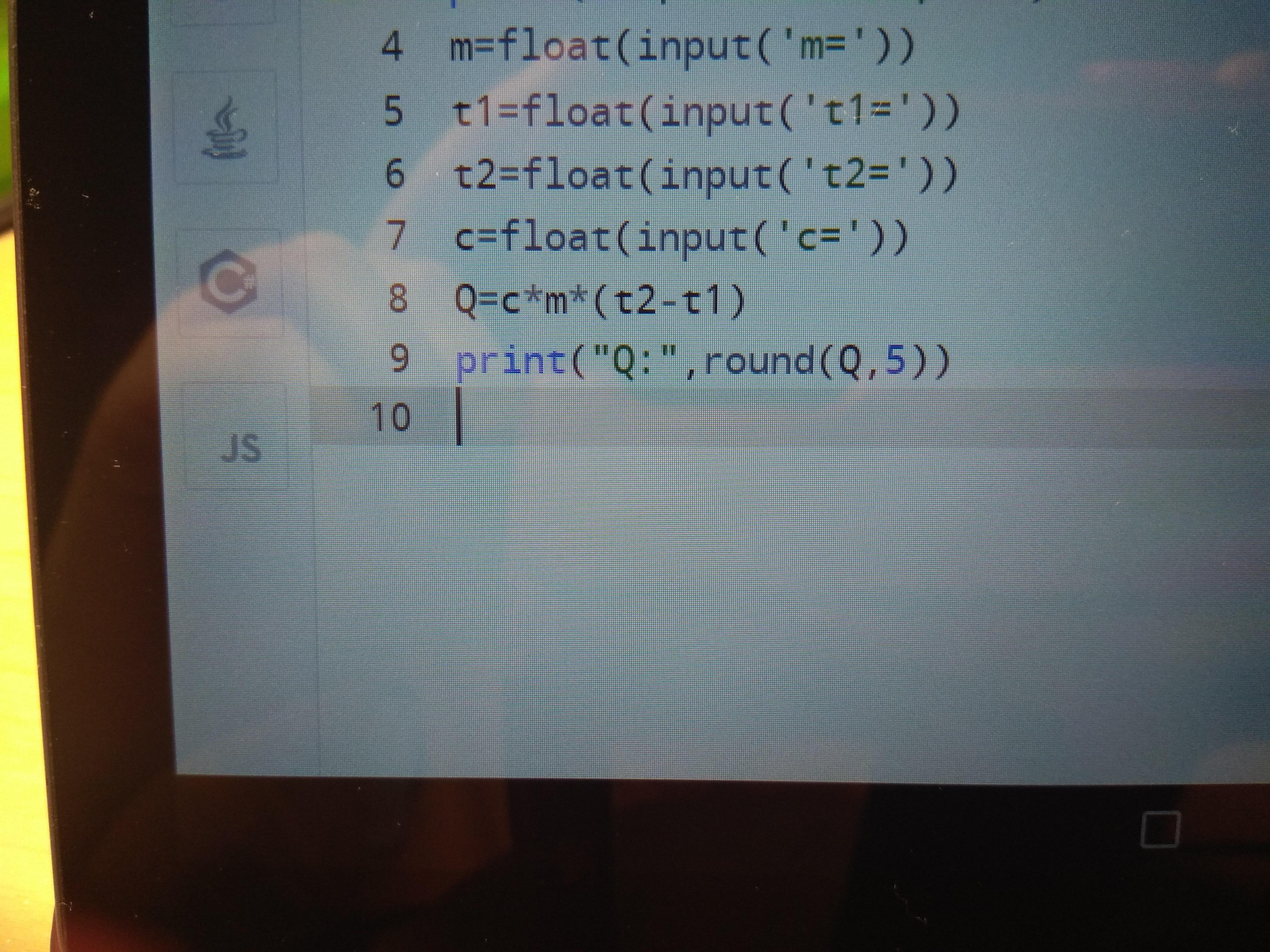 Складіть програму для знаходження кількості теплоти, яка потрібна для нагрівання тіла масою m, з початковою і кінцевою температурами тіла ї, і t2, питомою теплоємністю речовини с, яка обчислюється за формулою:Q=c×m(t2-t1)