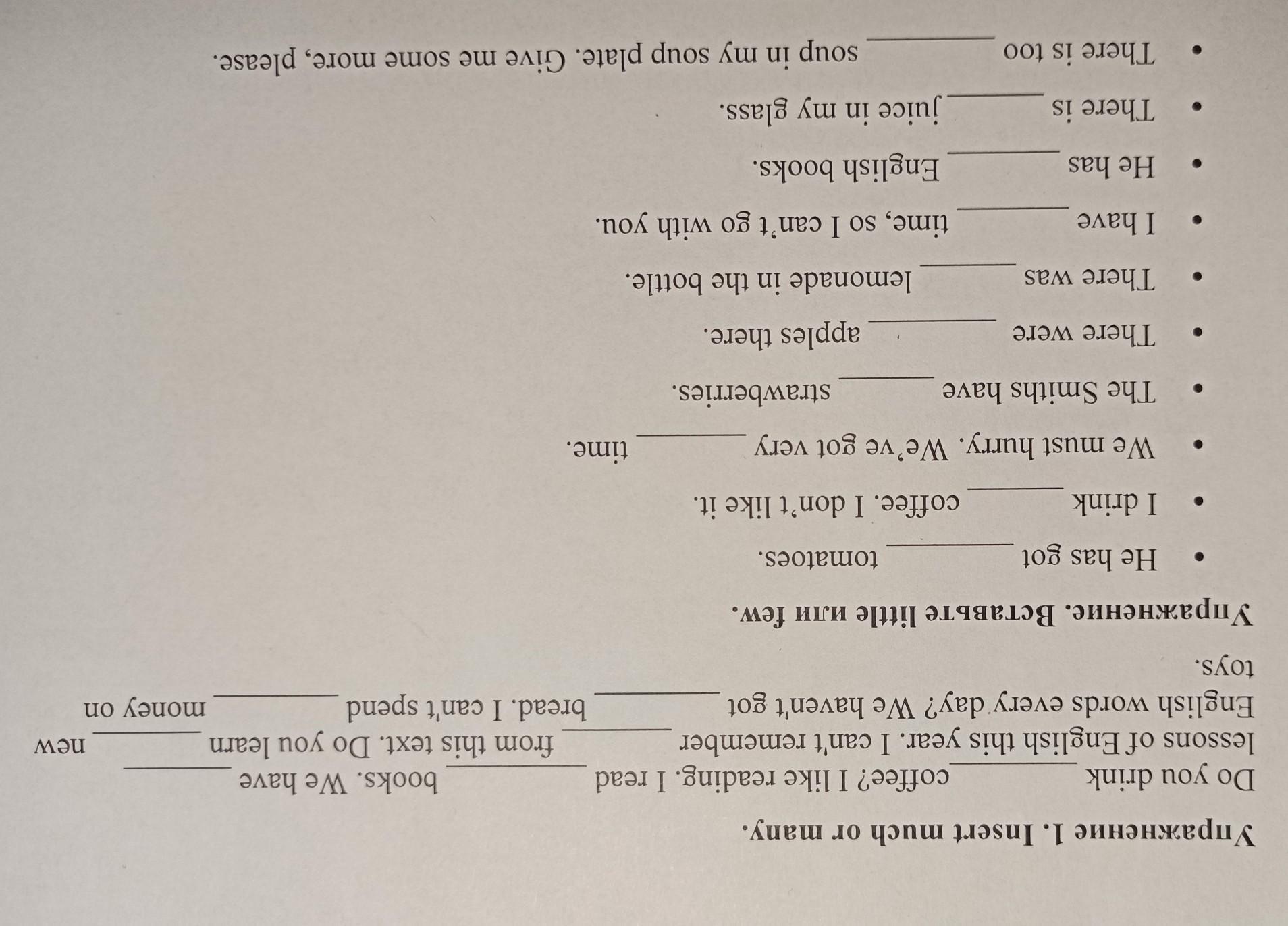 do you drink much coffee? I like reading I read many books . we have many lessons of English this year .I can't remember much from this text .do you learn many new English words everyday.we haven't got much bread. I can't spend much money on toys