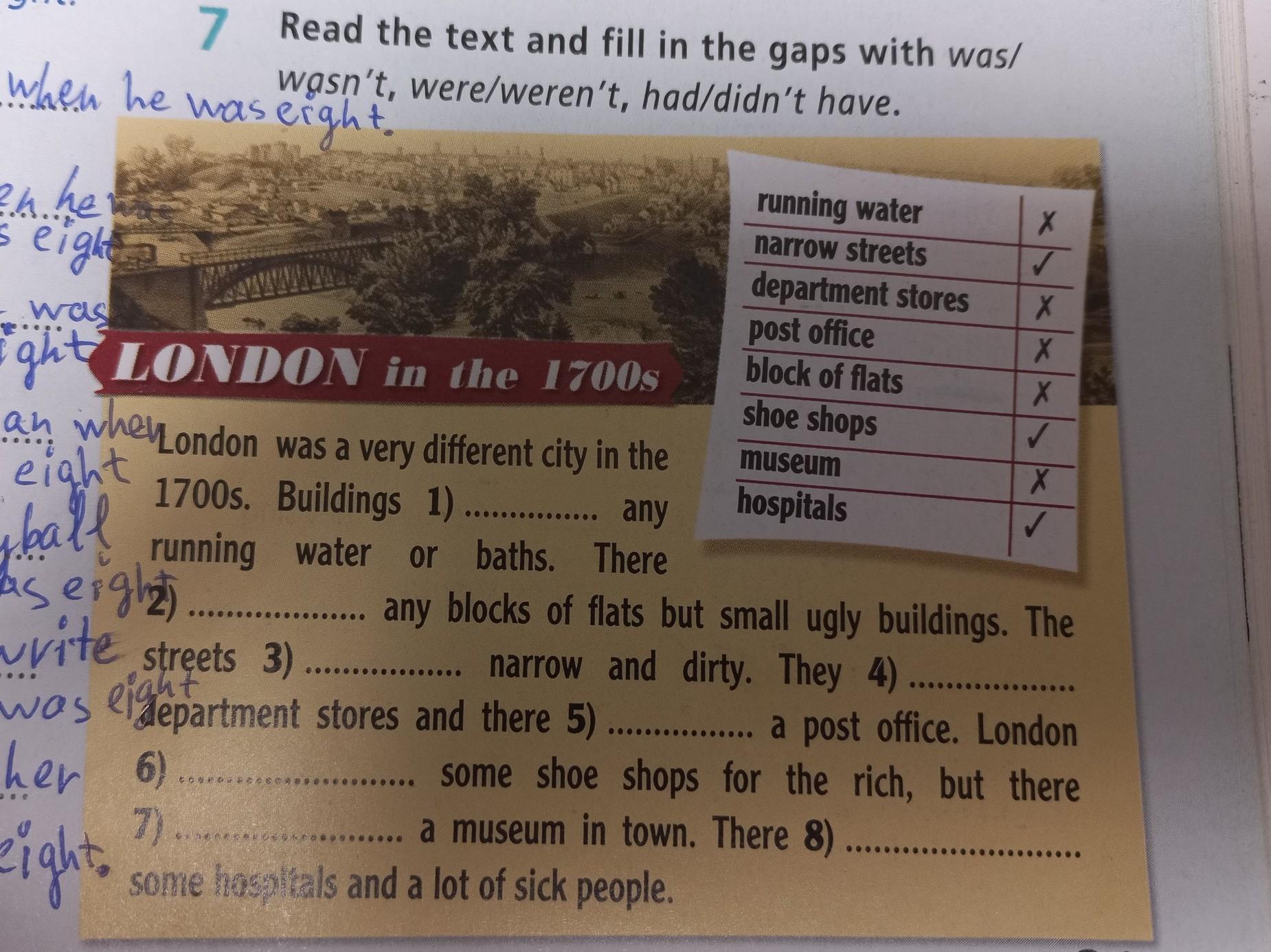 СРОЧНО!!! 7 Read the text and fill in the gaps with was/ wasn't, were/weren't, had/didn't have. he was eight. when ht ✓ running water Х narrow streets ✓ department stores Х post office Х block of flats LONDON in the 1700s Х shoe shops ✓ London was a very different city in the museum X 1700s. Buildings 1) ............... any hospitals l running water or baths. There ........ any blocks of flats but small ugly buildings. The te streets 3) ................. narrow and dirty. They 4) ....... seiglepartment stores and there 5) ............ a post office. London 6) some shoe shops for the rich, but there 7) ........ ........................ a museum in town. There 8)....... at some hospitals and a lot of sick people. 81 eigla... ao 8