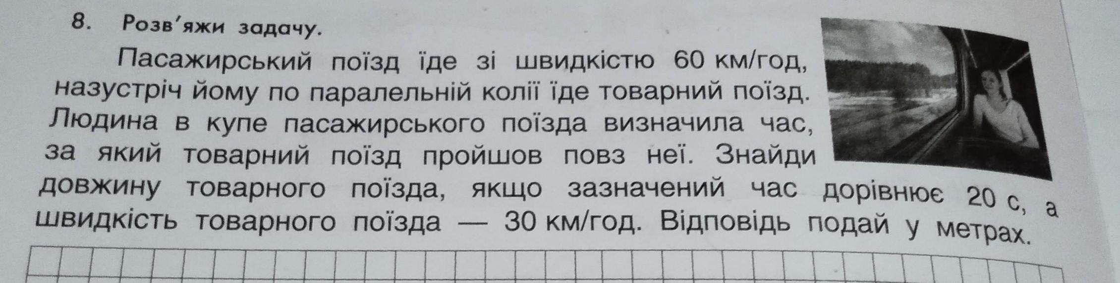 Швидкість товарного потягу відносно людини дорівнює їх сумарній швидкості, тобто 60+30=90 км/год. Час 20 с=20/3600=1/180год. Тоді довжина потягу: 90*(1/180)=1/2 км=500 м