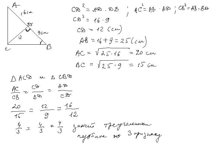 Высота CD прямоугольного треугольника ABC делит гипотенузу, AВ на части AD =16 см, BD = Эсм. Докажите, что треугольник ACD подобен треугольнику CBD, и найдите высоту CD.
