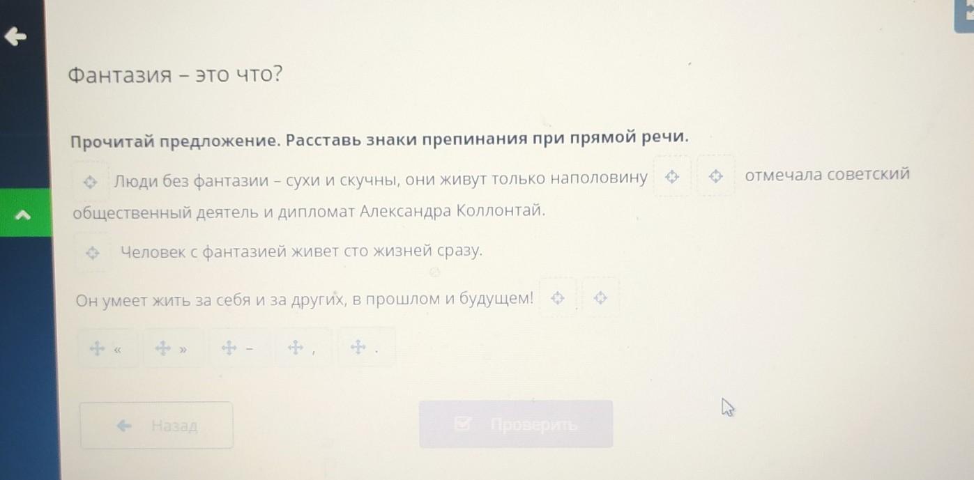 Фантазия – это что? Прочитай предложение. Расставь знаки препинания при прямой речи. отмечала советский Люди без фантазии – сухи и скучны, они живут только наполовину общественный деятель и дипломат Александра Коллонтай. Человек с фантазией живет сто жизней сразу. Он умеет жить за себя и за других, в прошлом и будущем ф» >> Назад Проверить
