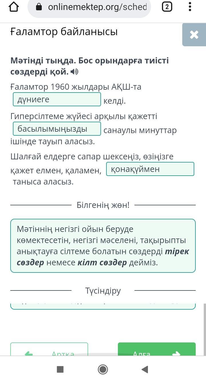 Мәтінді тыңда. Бос орындарға тиісті сөздерді қой. ) Ғаламтор 1960 жылдары АҚШ-та келді, Гиперсілтеме жүйесі арқылы қажетті санаулы минуттар ішінде тауып аласыз. Шалғай елдерге сапар шексеңіз, өзіңізге қажет елмен, қаламен, аласыз. таныса аласыз быстрее помогите даю балов помогите быстро