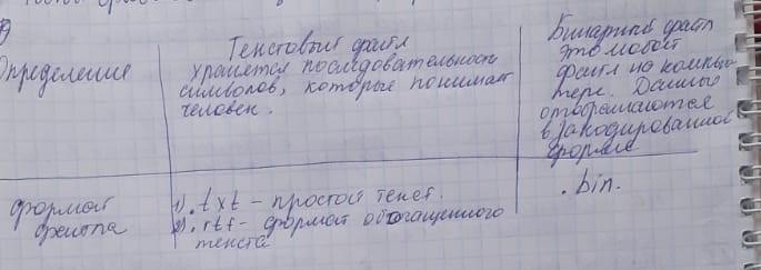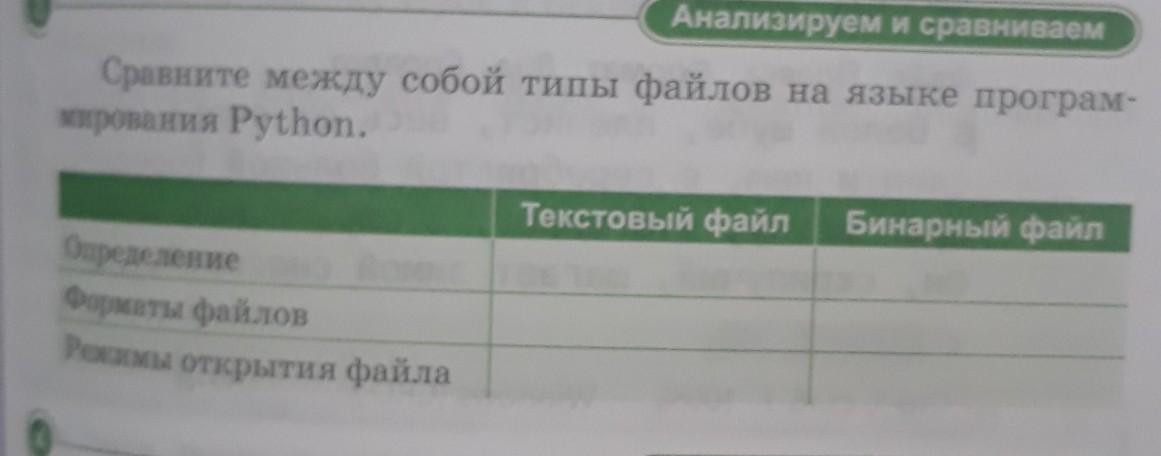 Сравните между собой типы файлов на языке програм- мирования Python. Текстовый файл Бинарный файл Определение Форматы файлов Режимы открытия файла
