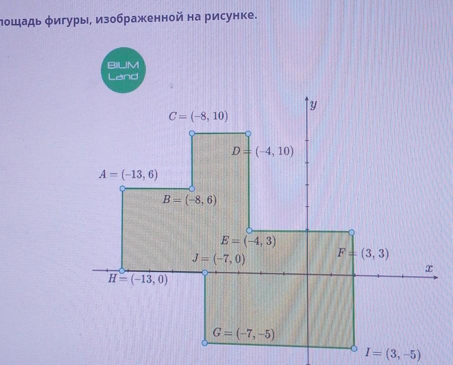 Найди площадь фигуры, изображенной на рисунке. BILIM Land Ту C = (-8, 10) D=(-4, 10) А= (-13, 6) В = (-8, 6) E = (-4, 3) J= (-7,0) F4 (3, 3) Т. H = (-13, 0) G= (-7, -5) I=(3,-5)