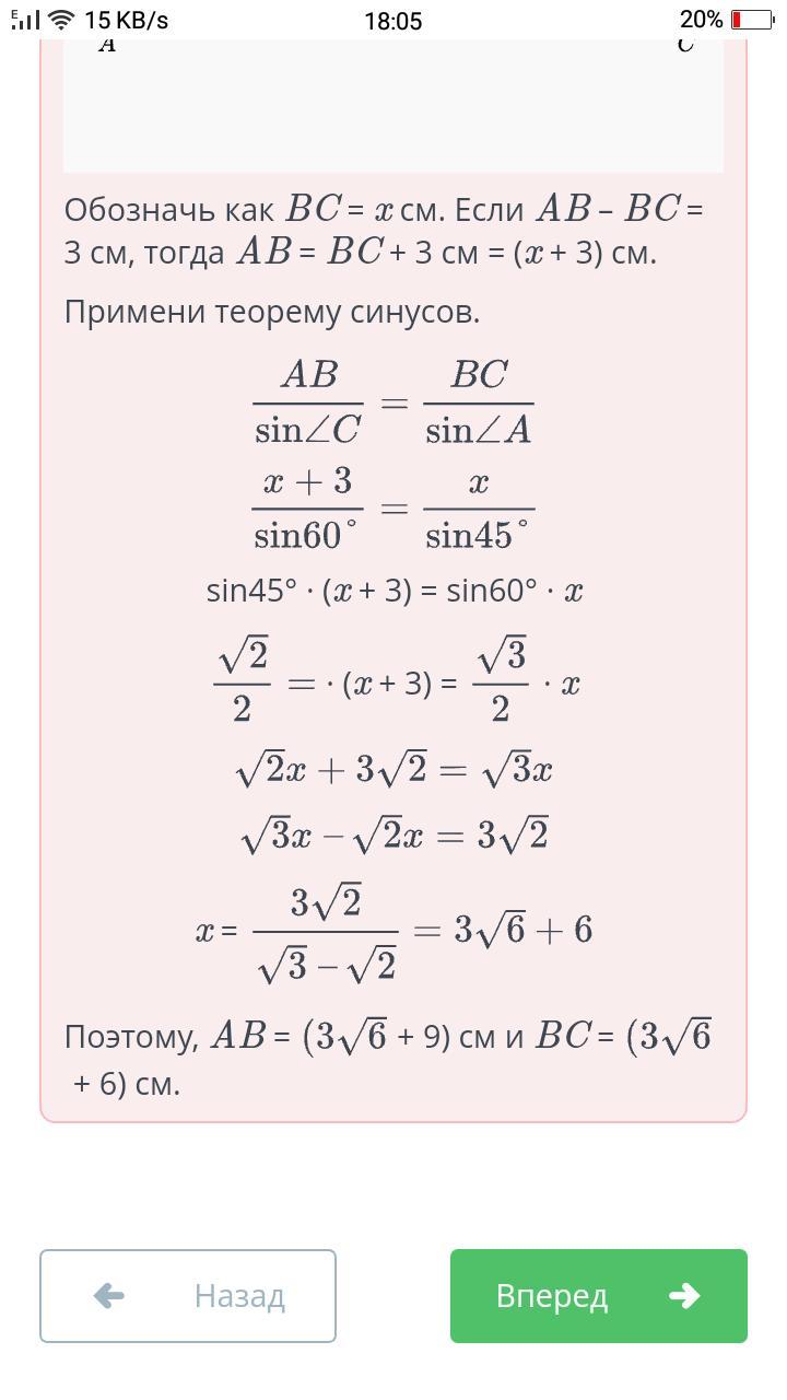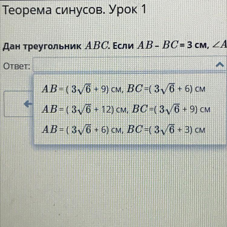 Дан треугольник ABC. Если AB – BC = 3 см, ∠A = 45° и ∠C = 60°, то найди длины сторон AB и BC.