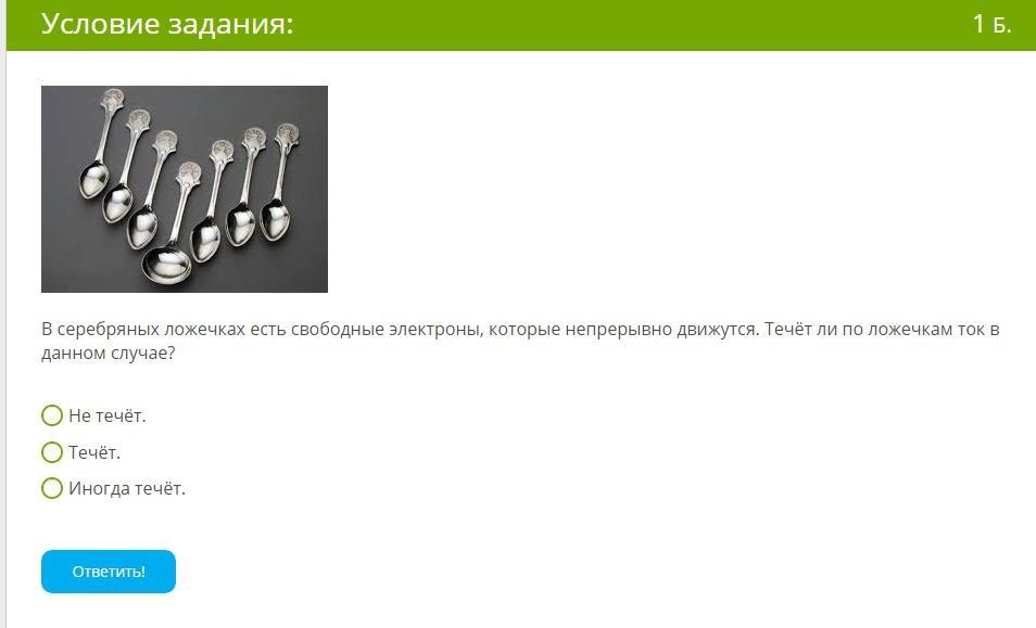 В серебряных ложечках есть свободные электроны, которые непрерывно движутся. Течёт ли по ложечкам ток в данном случае?