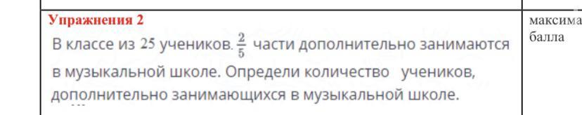 в классе из 25 учеников 2/5 части дополнительно занимаются в музыкальной школе.Определи количество учеников дополнительно занимающихся в музыкальной школе