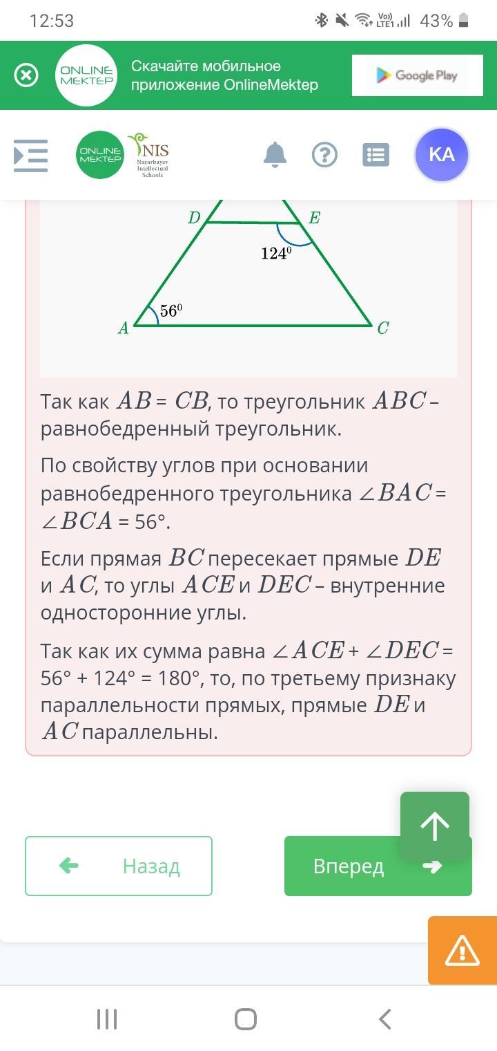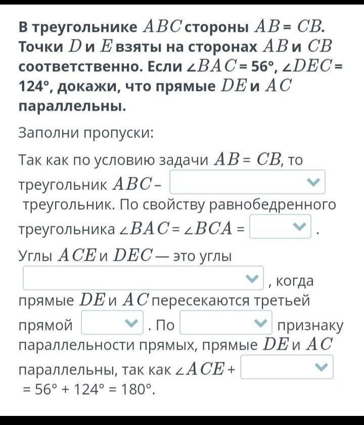 Параллельные прямые, их признаки и свойства. Урок 1 В треугольнике ABC стороны AB = CB. Точки D и E взяты на сторонах AB и CB соответственно. Если ∠BAC = 56°, ∠DEC = 124°, докажи, что прямые DE и AC параллельны. Заполни пропуски: Так как по условию задачи AB = CB, то треугольник ABC – треугольник. По свойству равнобедренного треугольника ∠BAC = ∠BCA = . Углы ACE и DEC — это углы , когда прямые DE и AC пересекаются третьей прямой . По признаку параллельности прямых, прямые DE и AC параллельны, так как ∠ACE + = 56° + 124° = 180°. Назад Проверить