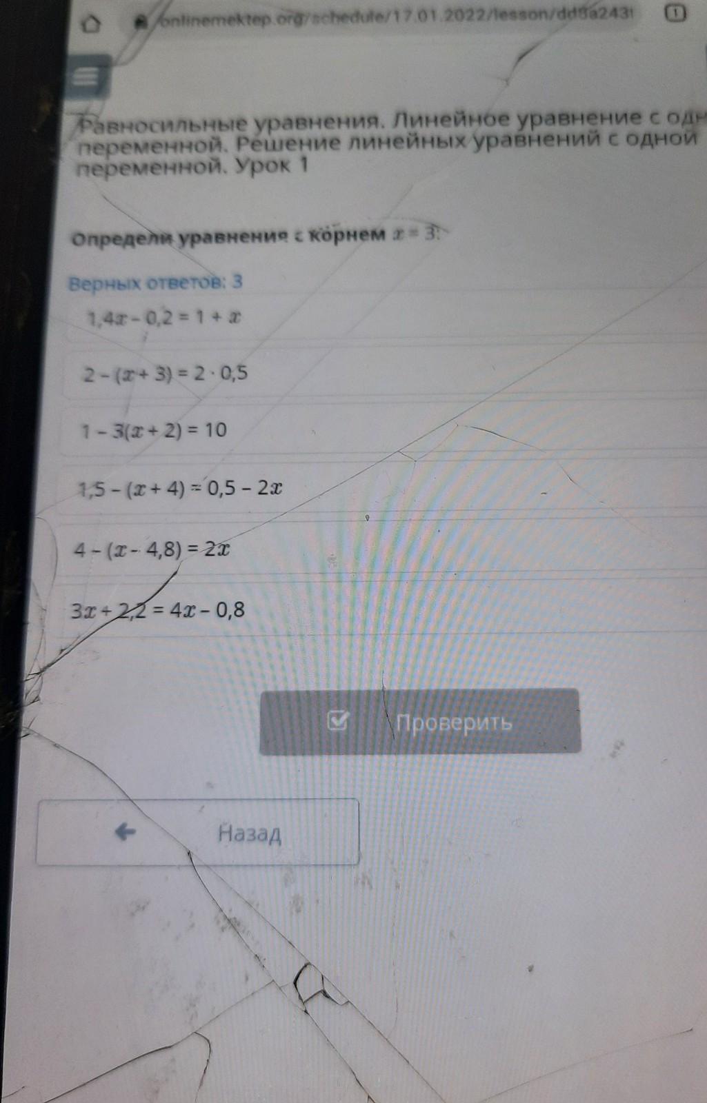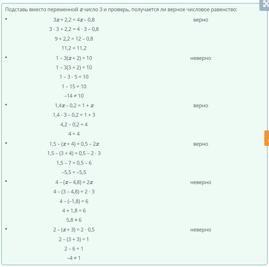 Равносильные уравнения. Линейное уравнение с одной переменной. Решение линейных уравнений с одной переменной. Урок 1 Определи уравнение с корнем х = 3: Верных ответов: 3 1,42 -0,2 = 1 + 2 2-(Z + 3) = 2.0,5 1 - 3(3+2) = 10 - 1,5 - (2 + 4) = 0,5 - 2x 4- (1 - 4,8) = 22 - 32 4 2,2 = 4x - 0,8