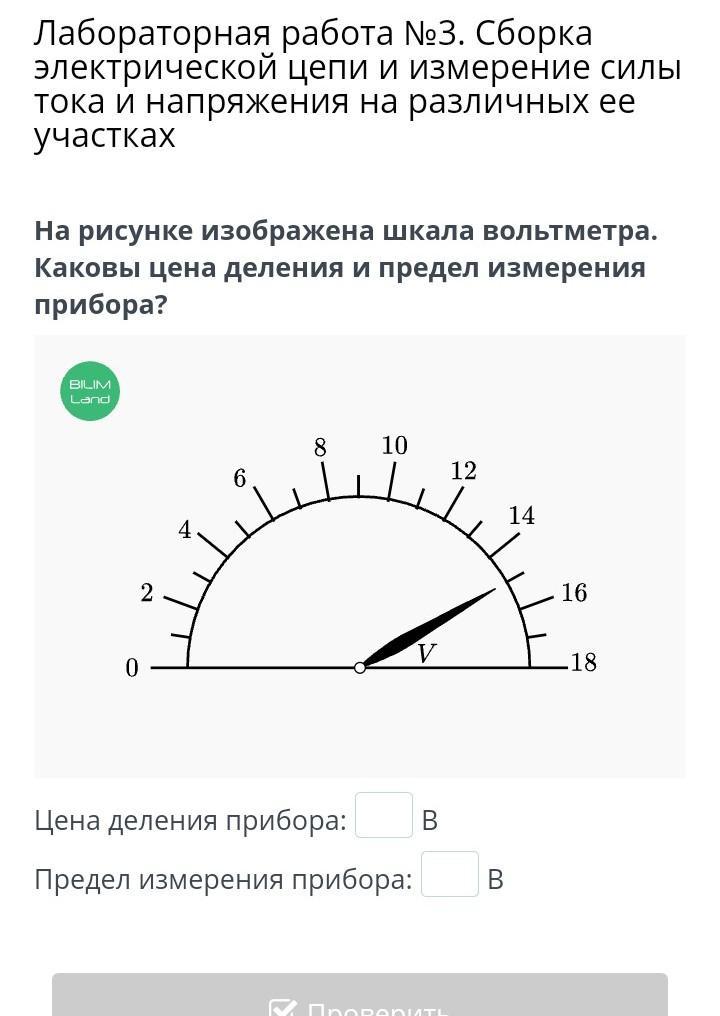 На рисунке изображена шкала вольтметра. Каковы цена деления и предел измерения прибора?