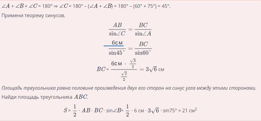 Дан треугольник ABC. Если AB = 6 см, ∠A = 60° и ∠B = 75°, то найди площадь треугольника ABC. Вычисли ответ с помощью микрокалькулятора, округли до целого числа.