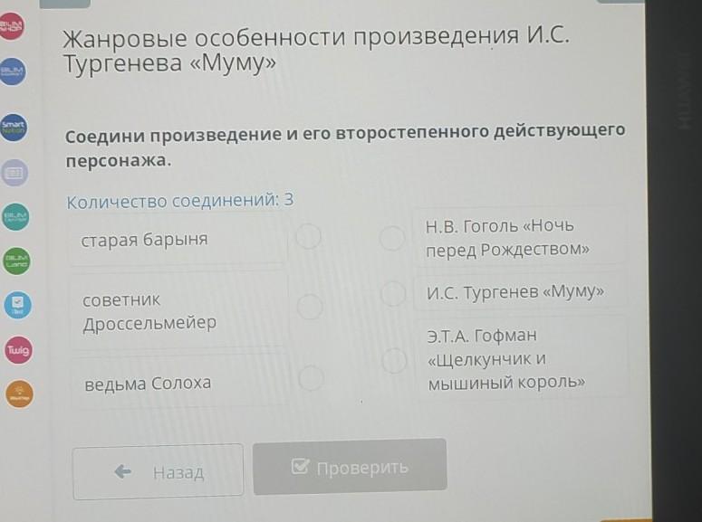 Жанровые особенности произведения И.С. Тургенева «Муму» Соедини произведение и его второстепенного действующего персонажа. Количество соединений: 3 старая барыня Н.В. Гоголь «Ночь перед Рождеством» И.С. Тургенев «Муму» советник Дроссельмейер Э.Т.А. Гофман «Щелкунчик и мышиный король» ведьма Солоха
