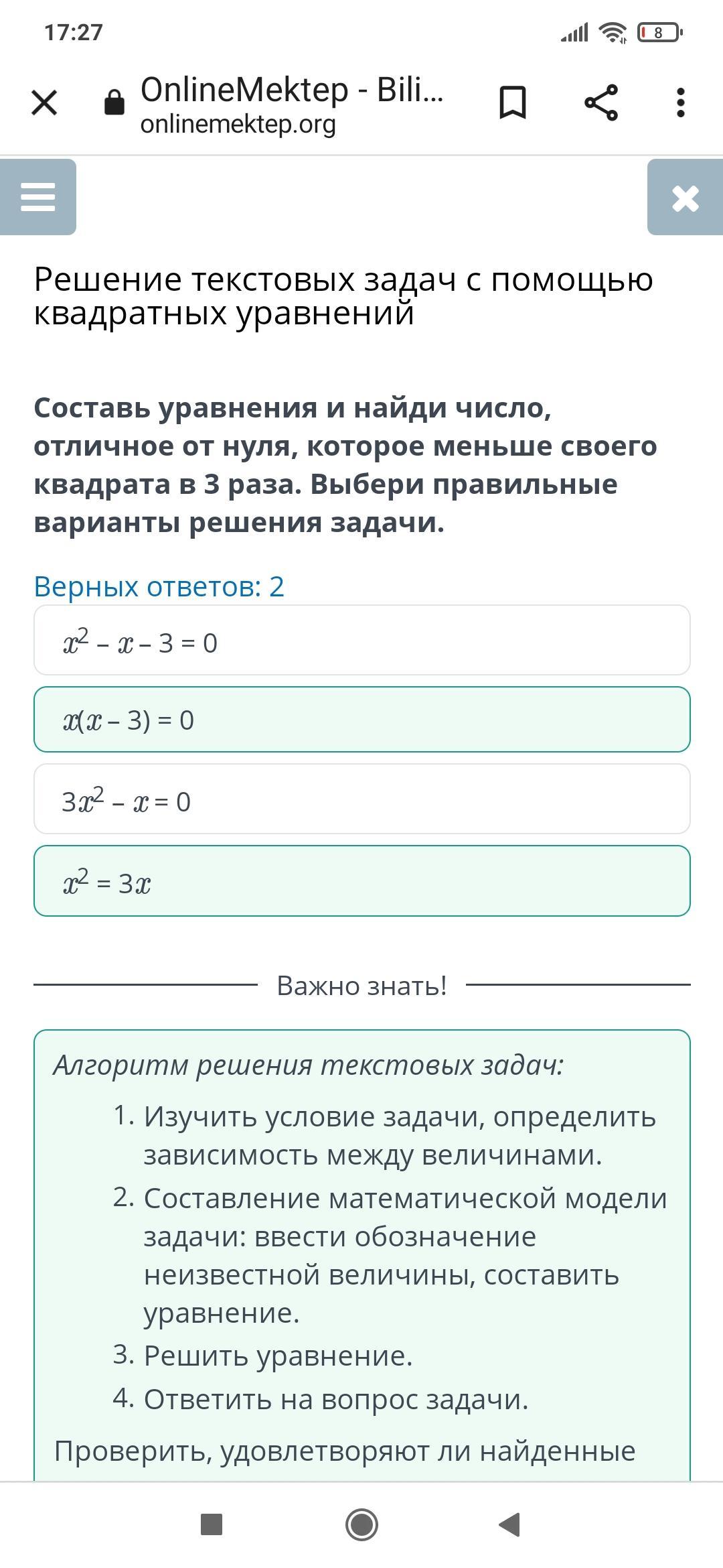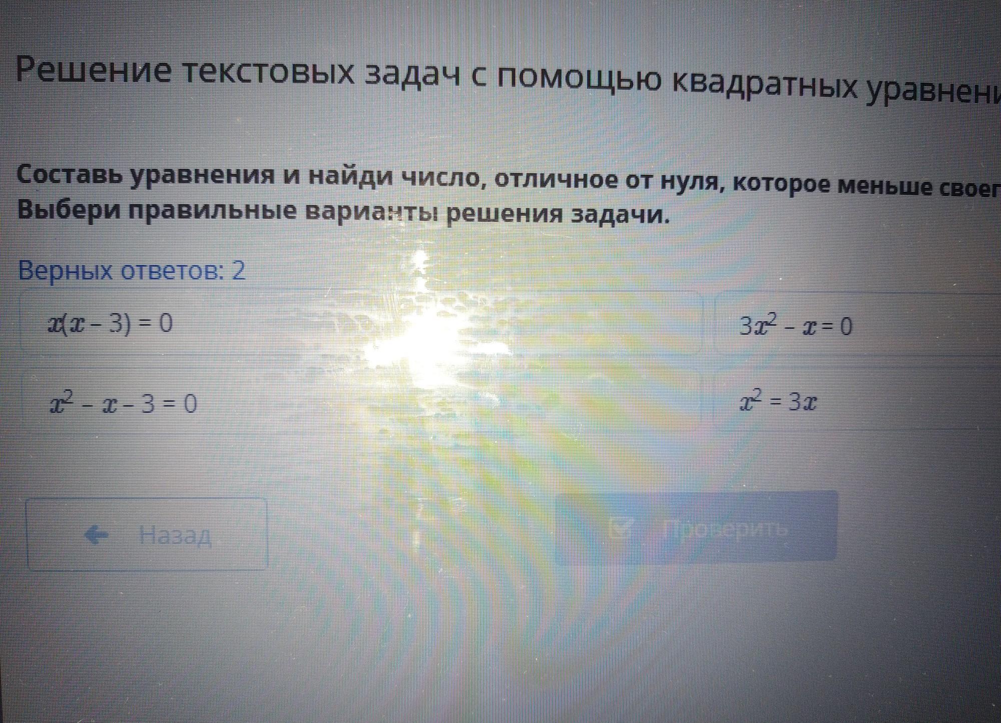Решение текстовых задач с помощью квадратных уравнений Урок 2: Составь уравнения и найди число, отличное от нуля, которое мен Выбери правильные варианты решения задачи. Верных ответов: 2 xx – 3) = 0 32 -