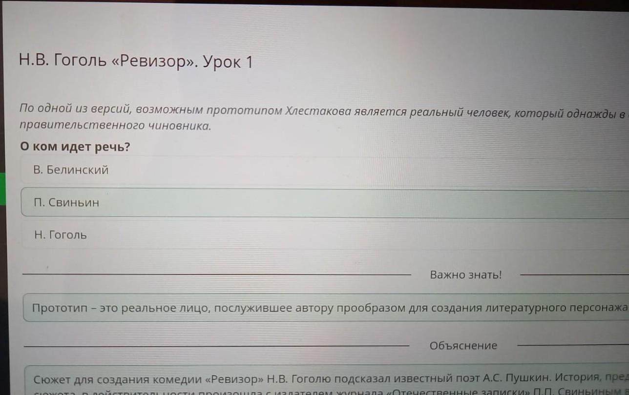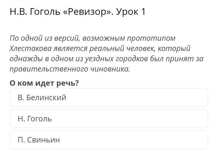 Н.В. Гоголь «Ревизор». Урок 1 По одной из версий, возможным прототипом Хлестакова является реальный человек, который однажды в одном из уездных городков был принят за правительственного чиновника. О ком идет речь? В. Белинский Н. Гоголь П. Свиньин