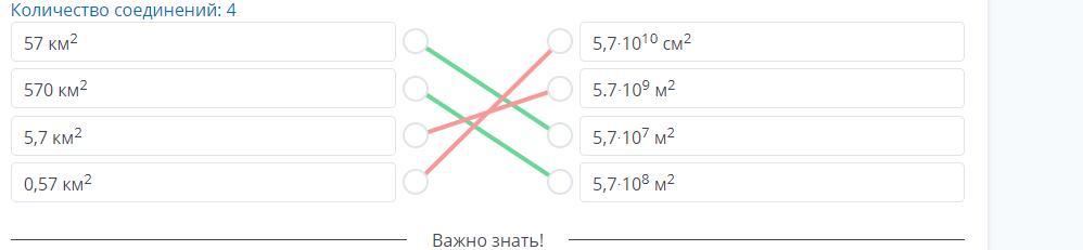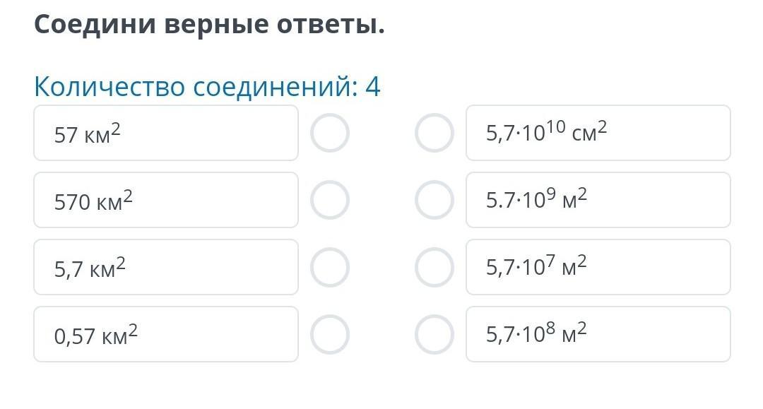 Площадь фигуры и ее свойства. Урок 1 Соедини верные ответы. Количество соединений: 4 57 км2 570 км2 5,7 км2 0,57 км2 5,7∙1010 cм2 5.7∙109 м2 5,7∙107 м2 5,7∙108 м2 помогите пожалуста срочноо