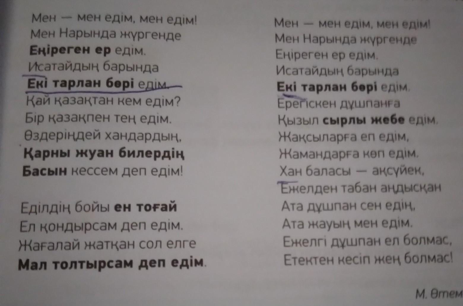 Еңіреген ер едім.Екі тарлан бөрі едім.Бір қазақпен тең едім.Қарны жуан билердің Басын кессем деп едім.Мал толтырсам деп едім.Қызыл сырлы жебе едім.Жамандарға көп едім.ата жауың мен едім.