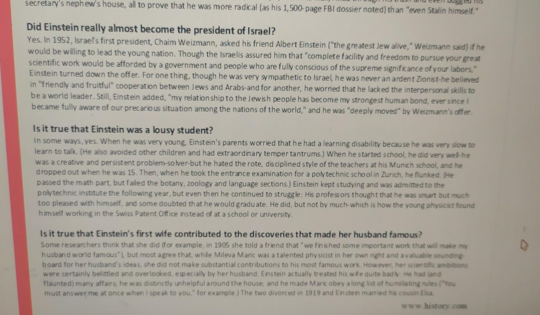 1) What made Einstein say ‘’I didn’t see any other way out’’? 2) Why did American officers think Einstein was a spy? 3) Who is Chaim Weizmann and what did he promise Einstein? 4) What can you say about Einstein’s education life? 5) Why did Einstein’s parent worry when he was young? 6) What was Einstein’s role in his wife’s career development?