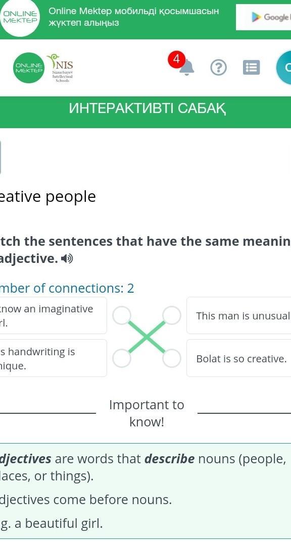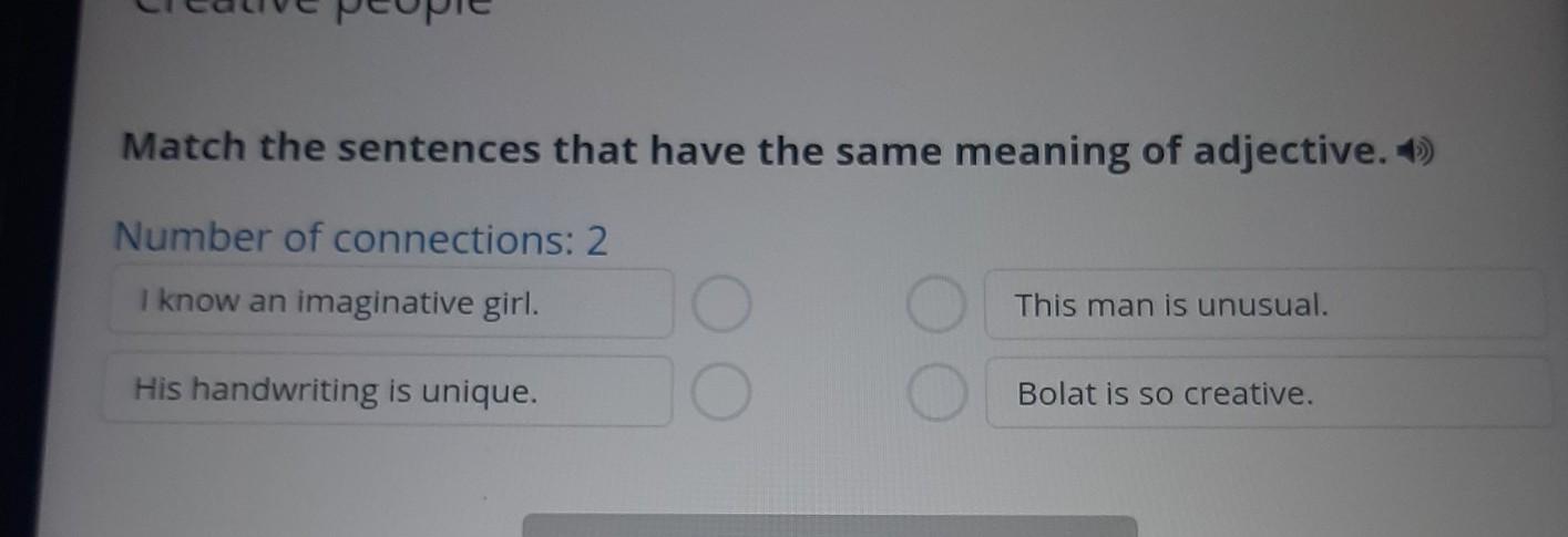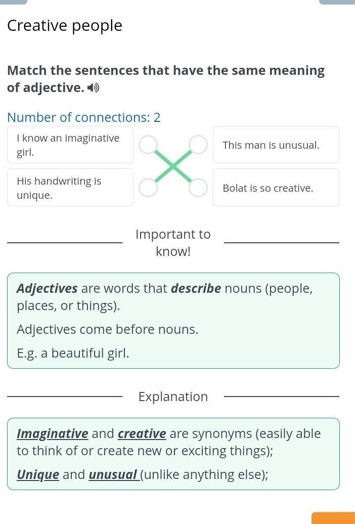 Creative people Match the sentences that have the same meaning of adjective. 4) Number of connections: 2 I know an imaginative girl This man is unusual. His handwriting is unique. Bolat is so creative. Check