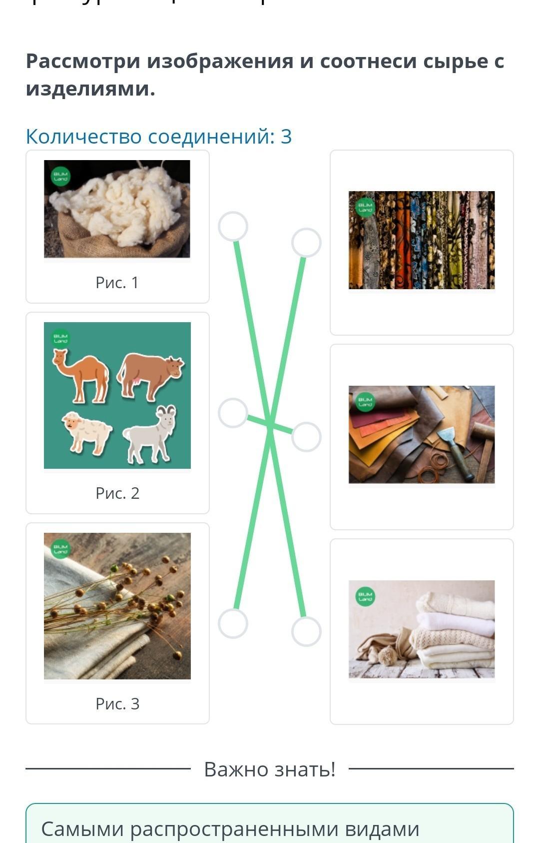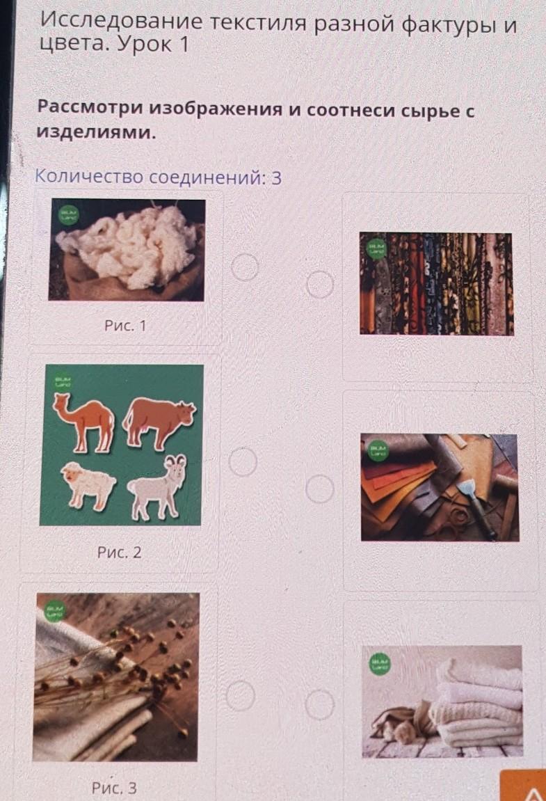 Урок 1 Рассмотри изображения и соотнеси сырье с Изделиями. Количество соединений: 3