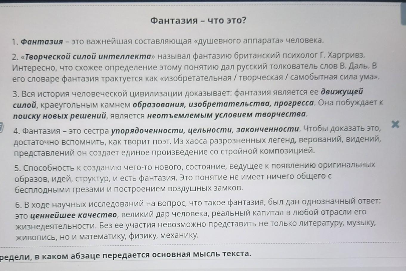 Прочитай текст «Фантазия – что это?» - Посмотреть Определи, в каком абзаце передается основная мысль текста. 1 2 3 4 5 6 ( III