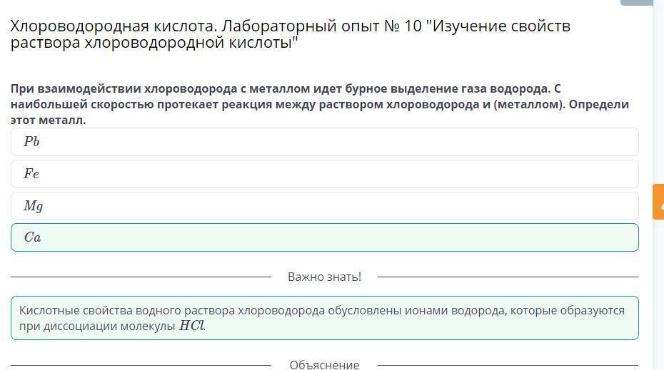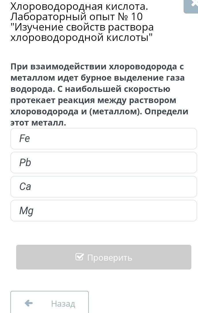 При взаимодействии хлороводорода с металлом идет бурное выделение газа водорода. С наибольшей скоростью протекает реакция между раствором хлороводорода и (металлом). Определи этот металл.