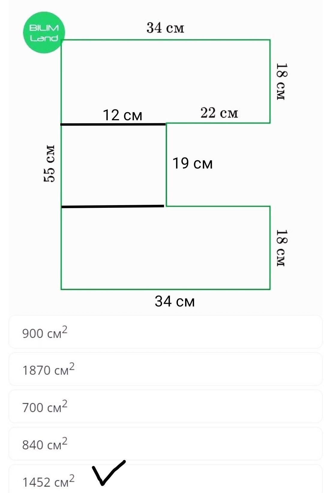 Прямоугольник, расположенный в середине комбинированной фигуры, имеет измерения 34 - 22 = 12 (см) и 55 - (18+18) = 55 - 36 = 19 (см). Его площадь равна S2 = 12•19 = 228 (см²).