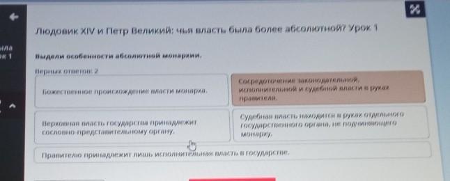 Людовик XIV и Петр Великий: чья власть была более абсолютной? Урок 1 Выдели особенности абсолютной монархии. Верных ответов: 2 Сосредоточение законодательной, исполнительной и судебной власти в руках правителя. Божественное происхождение власти монарха. Верховная власть государства принадлежит сословно-представительному органу. Судебная власть находится в руках отдельного государственного органа, не подчиняющего монарху. Правителю принадлежит лишь исполнительная власть в государстве. В Проверить Назад Активация Windows Чтобы активировать Wind раздел "Параметры".