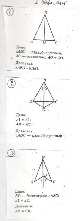 1. АВ=ВС, АО=СО по условию; ∠А=∠С по свойству углов при основании равнобедренного треугольника. ΔАВО=ΔСВО по 1 признаку равенства треугольников.