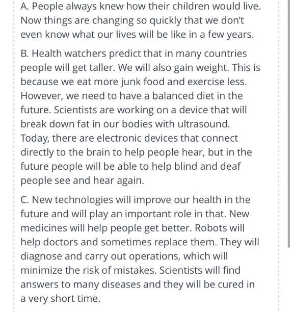 Read the text “Our body and health in the future” and choose sentences which are the most suitable to complete the sentence.
