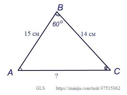 Дан треугольник АВС. Если АВ=15 см, ВС=14 см, угол В=60 градусов, то найди длинну стороны АС. СРОЧНО НУЖНО, ПОЖАЛУЙСТА!