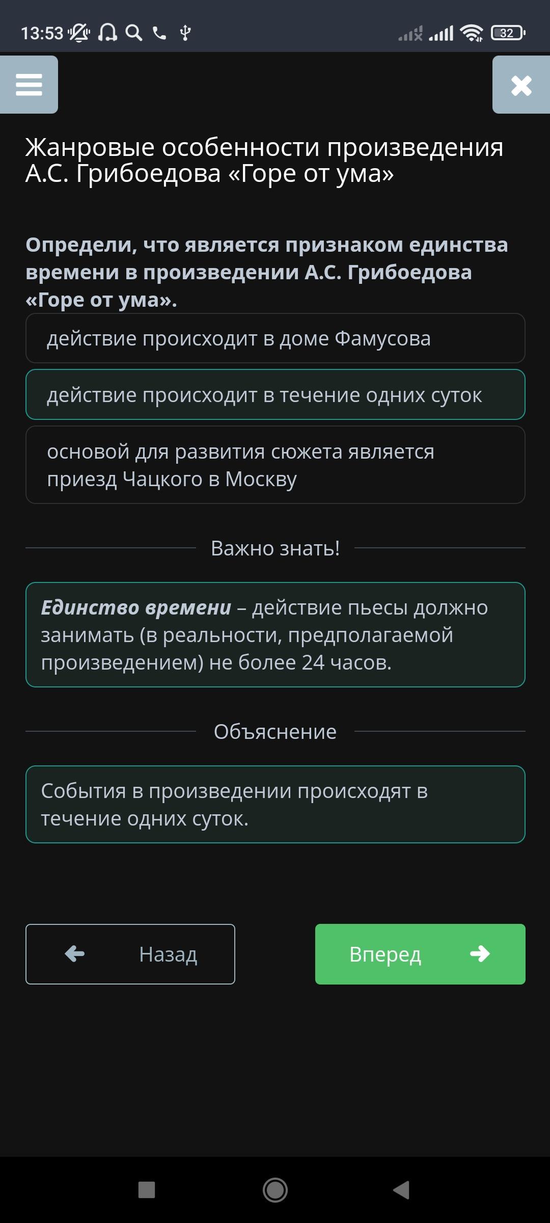определите, что является признаком единства времени произведения А.С.Грибоедов "Горе от ума"