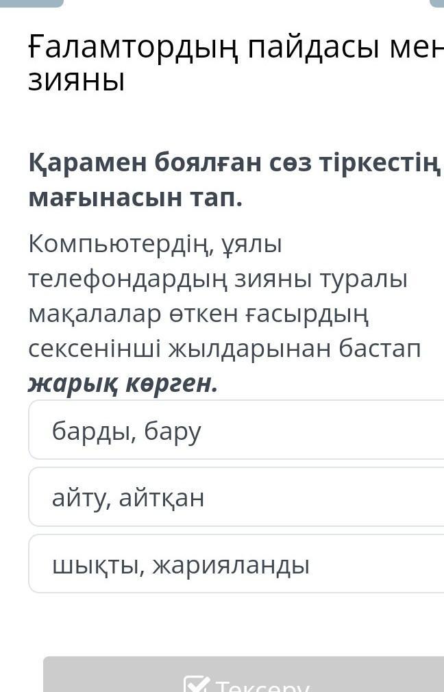 Ғаламтордың пайдасы мен зияны Қарамен боялған сөз тіркестің мағынасын тап. Компьютердiң, ұялы телефондардың зияны туралы мақалалар өткен ғасырдың сексенінші жылдарынан бастап жарық көрген. барды, бару айту, айтқан шықты, жарияланды