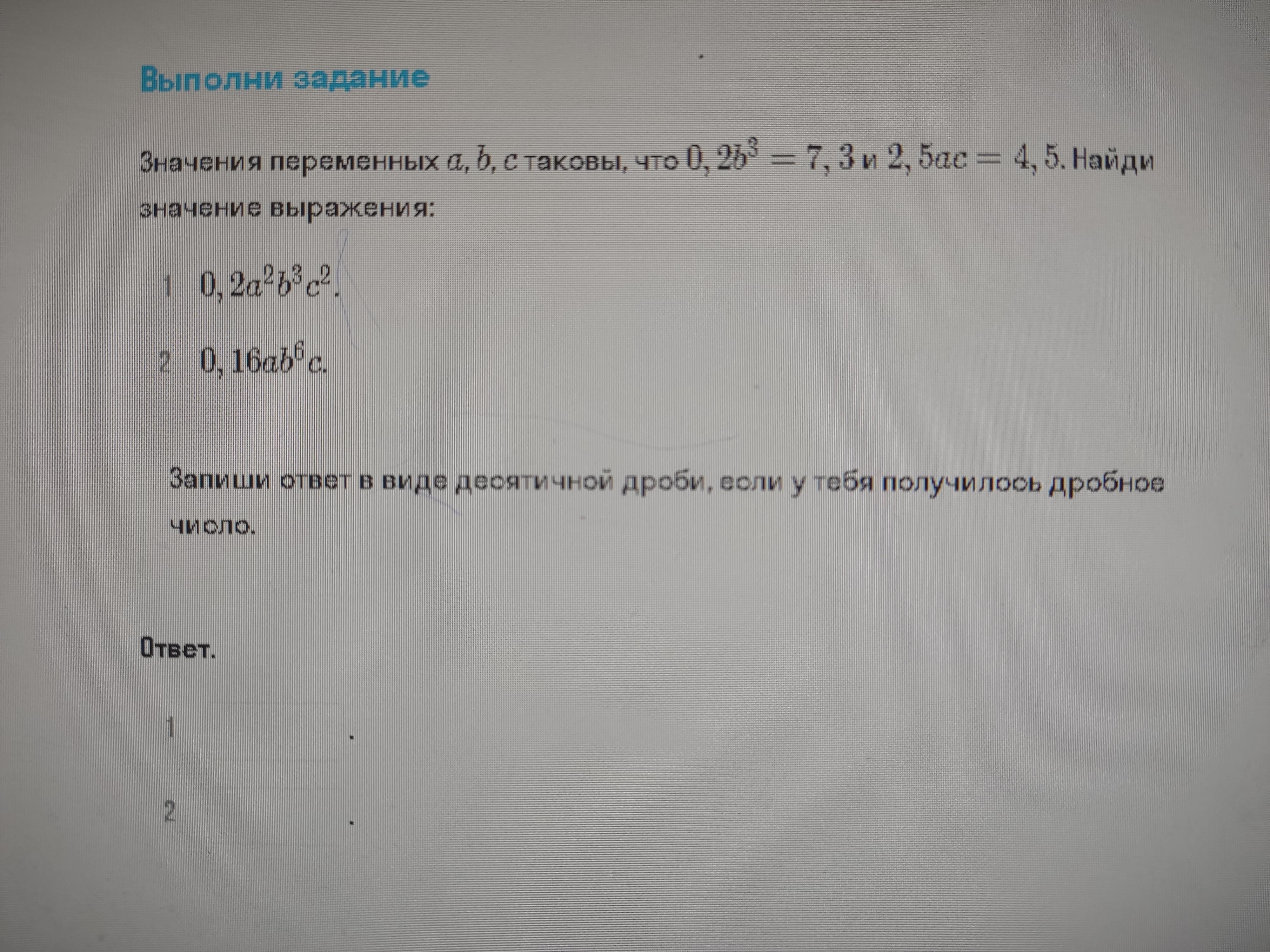 тут главное все приравнивать из первого видно что 0,2b³ получается без всяких преобразований, поэтому заменяем на 7,3. a²c²=(ac)² или из второго равенства a²c²=(ac)²=(4.5÷2.5)²