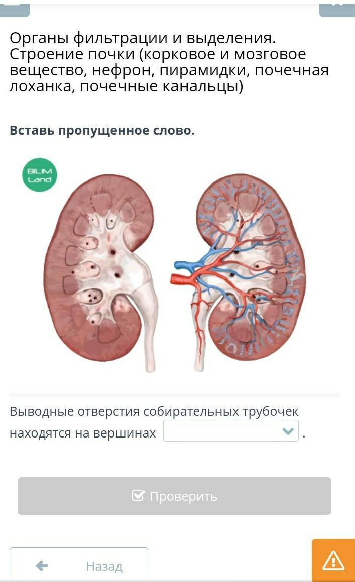 вставь пропущенные слово.выводные отверстия собирательных трубочек находятся на вершинах(лоханки,пирамидок,клубочков)