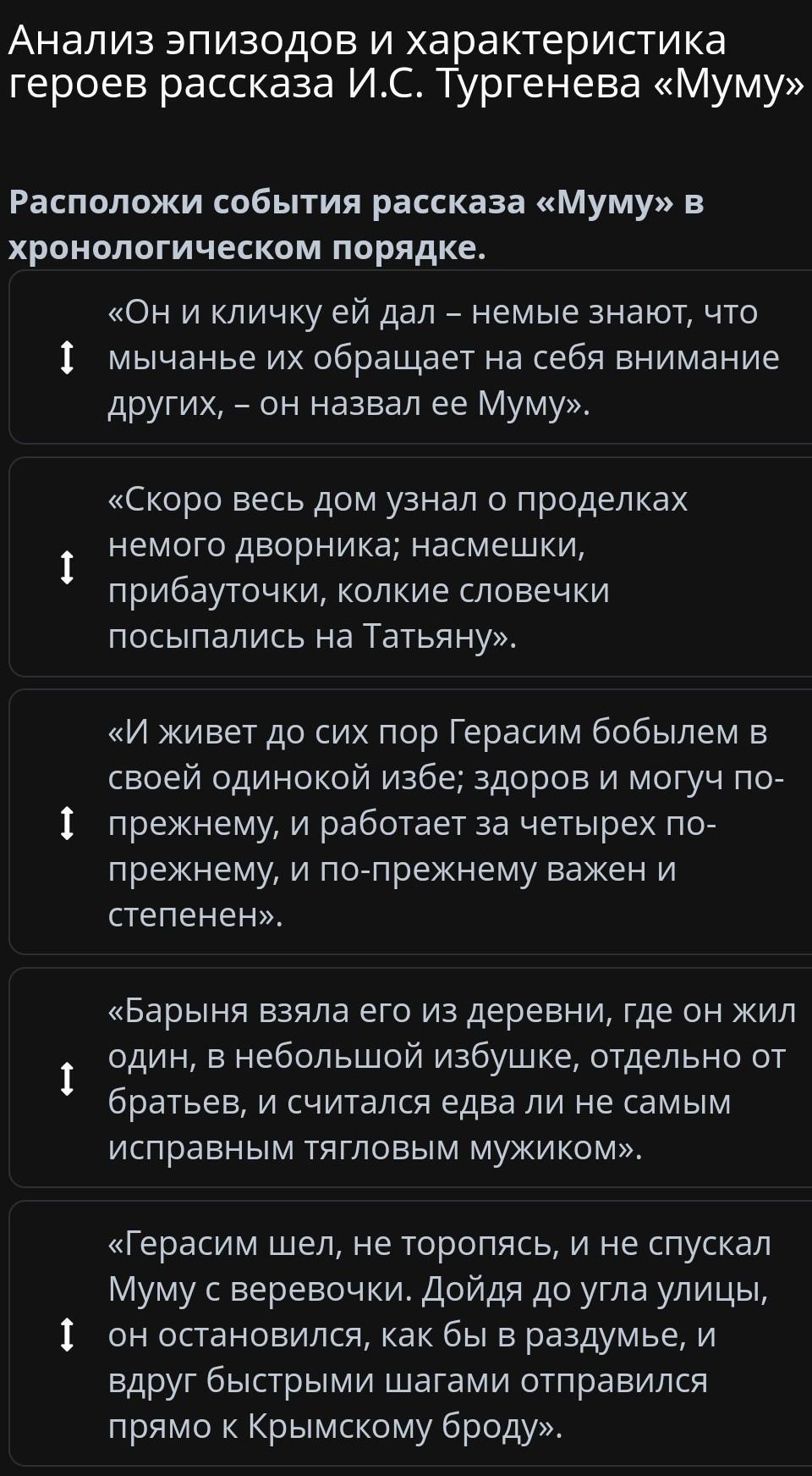 Анализ эпизодов и характеристика героев рассказа И.С. Тургенева «Муму» Расположи события рассказа «Муму» в хронологическом порядке. «Он и кличку ей дал - немые знают, что 1 мычанье их обращает на себя внимание AX, - он назвал ее Муму». «Скоро весь дом узнал о проделках немого дворника; насмешки, прибауточки, колкие словечки посыпались на Татьяну». «И живет до сих пор Герасим бобылем в своей одинокой избе; здоров и могуч по 1 прежнему, и работает за четырех по прежнему, и по-прежнему важен и степенен».