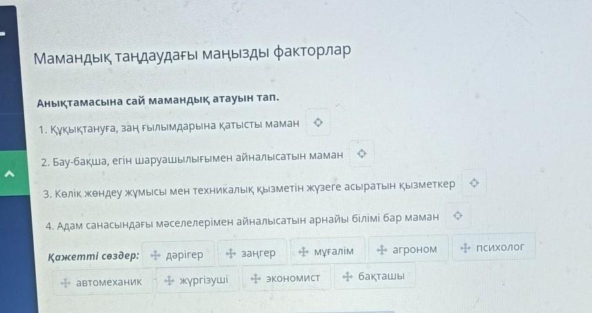 Мамандық таңдаудағы маңызды факторлар Анықтамасына сай мамандық атауын тап. 1. Құқықтануға, заң ғылымдарына қатысты маман 2. Бау-бақша, егін шаруашылығымен айналысатын маман 3. Көлік жөндеу жұмысы мен техникалық қызметін жүзеге асыратын қызметкер 4. Адам санасындағы мәселелерімен айналысатын арнайы білімі бар маман қажетті сөздер: Е дәрігер заңгер Hн мұғалім агроном не психолог автомеханик жүргізуші не экономист - бақташы